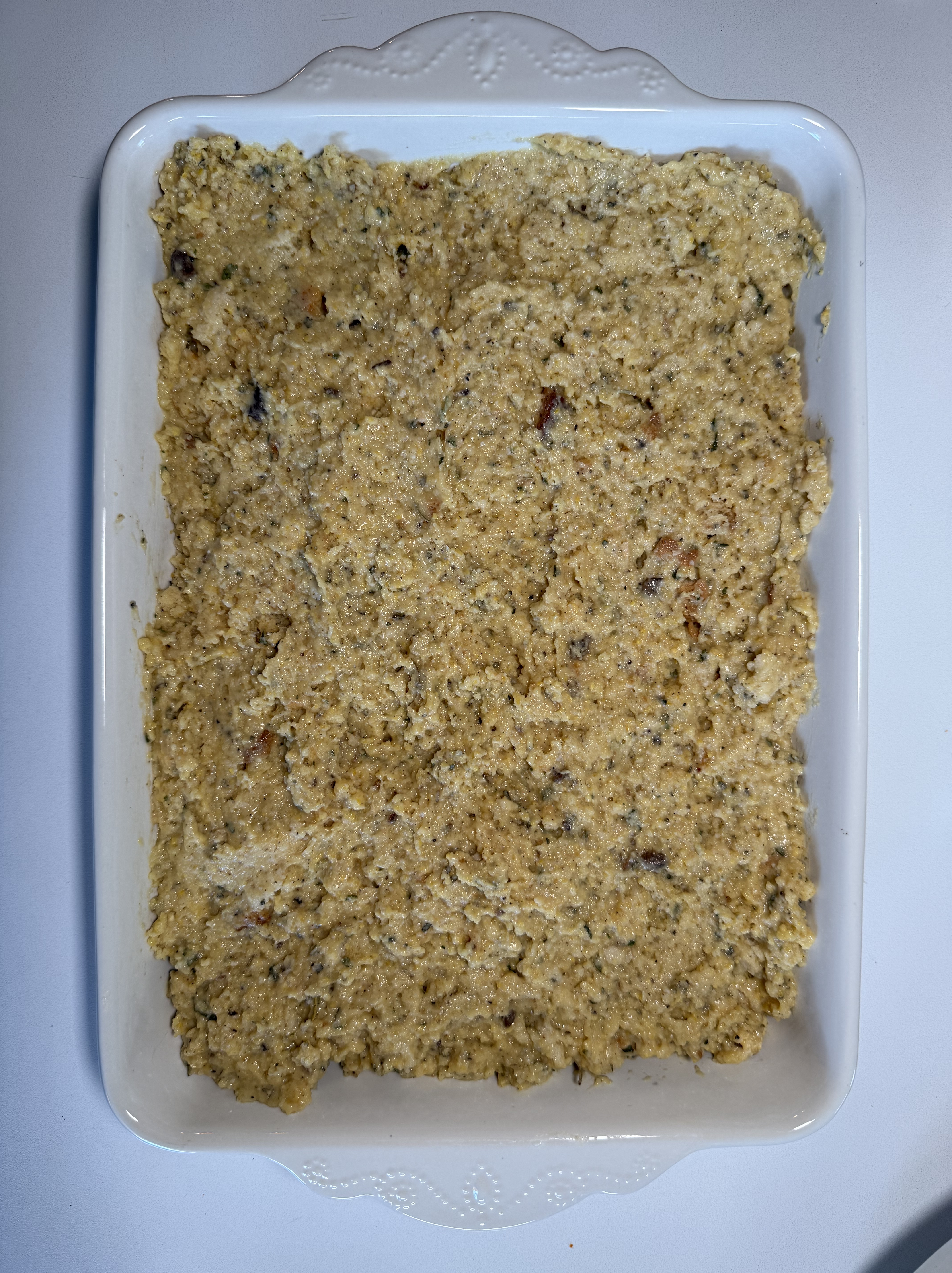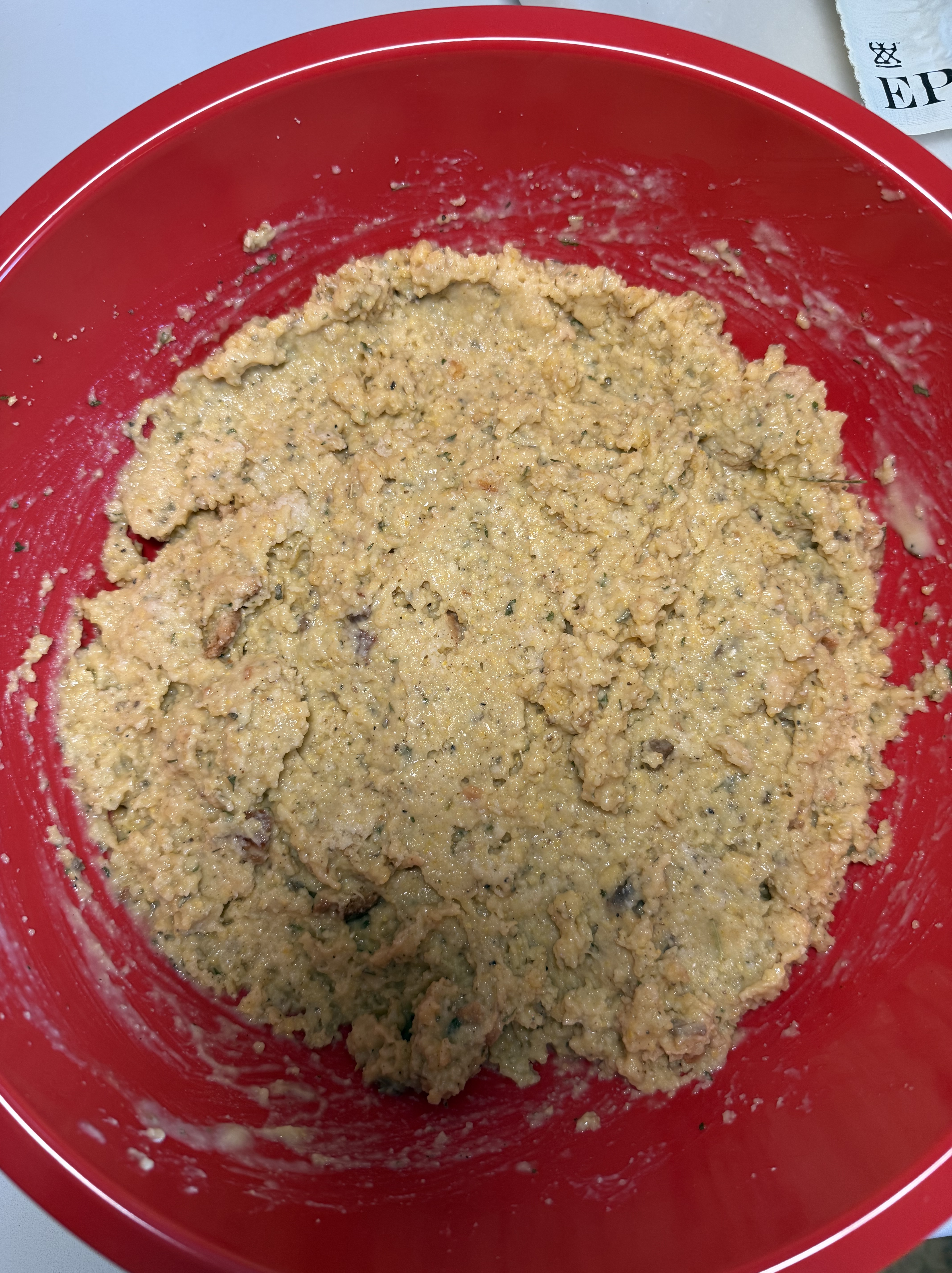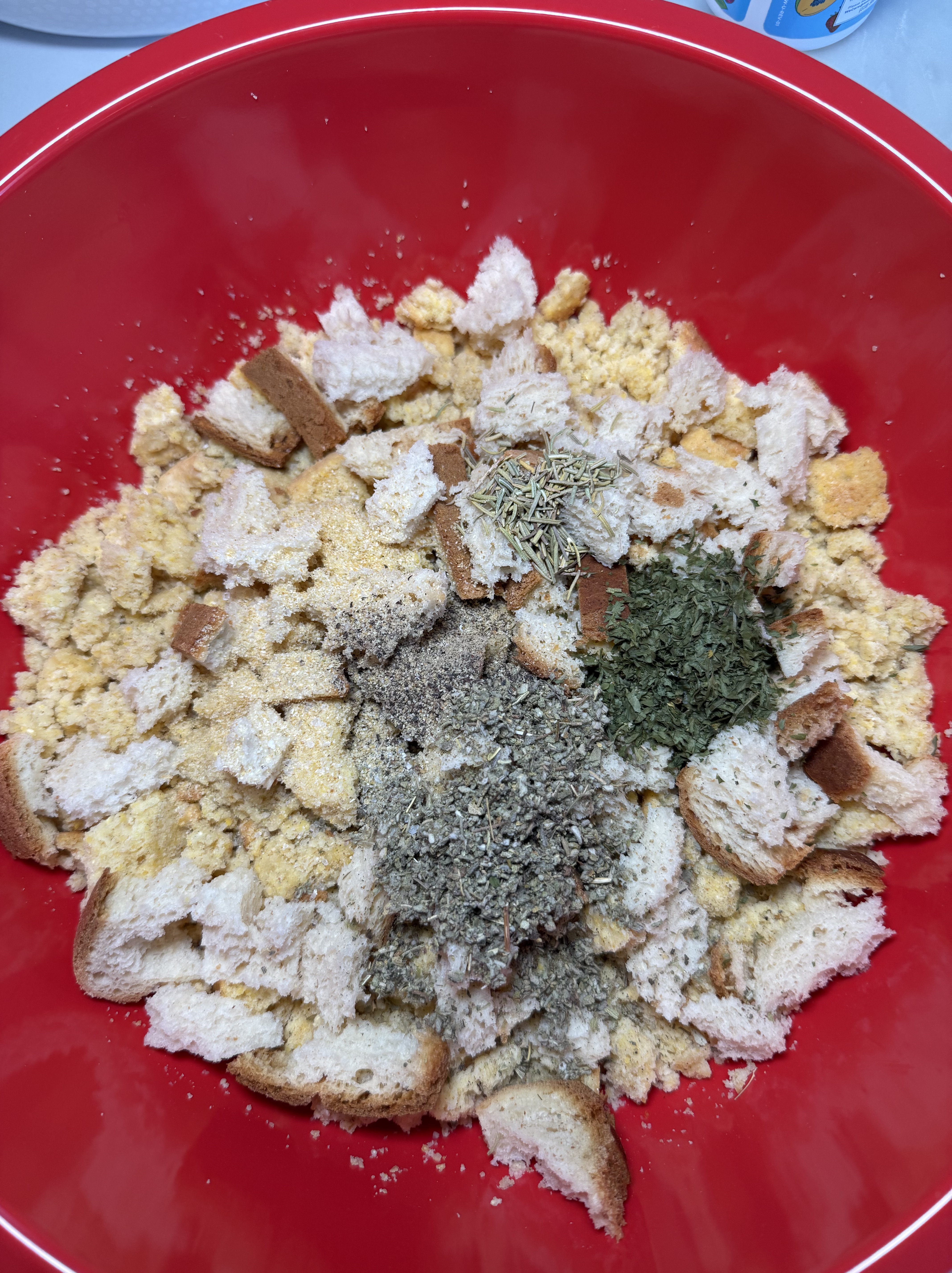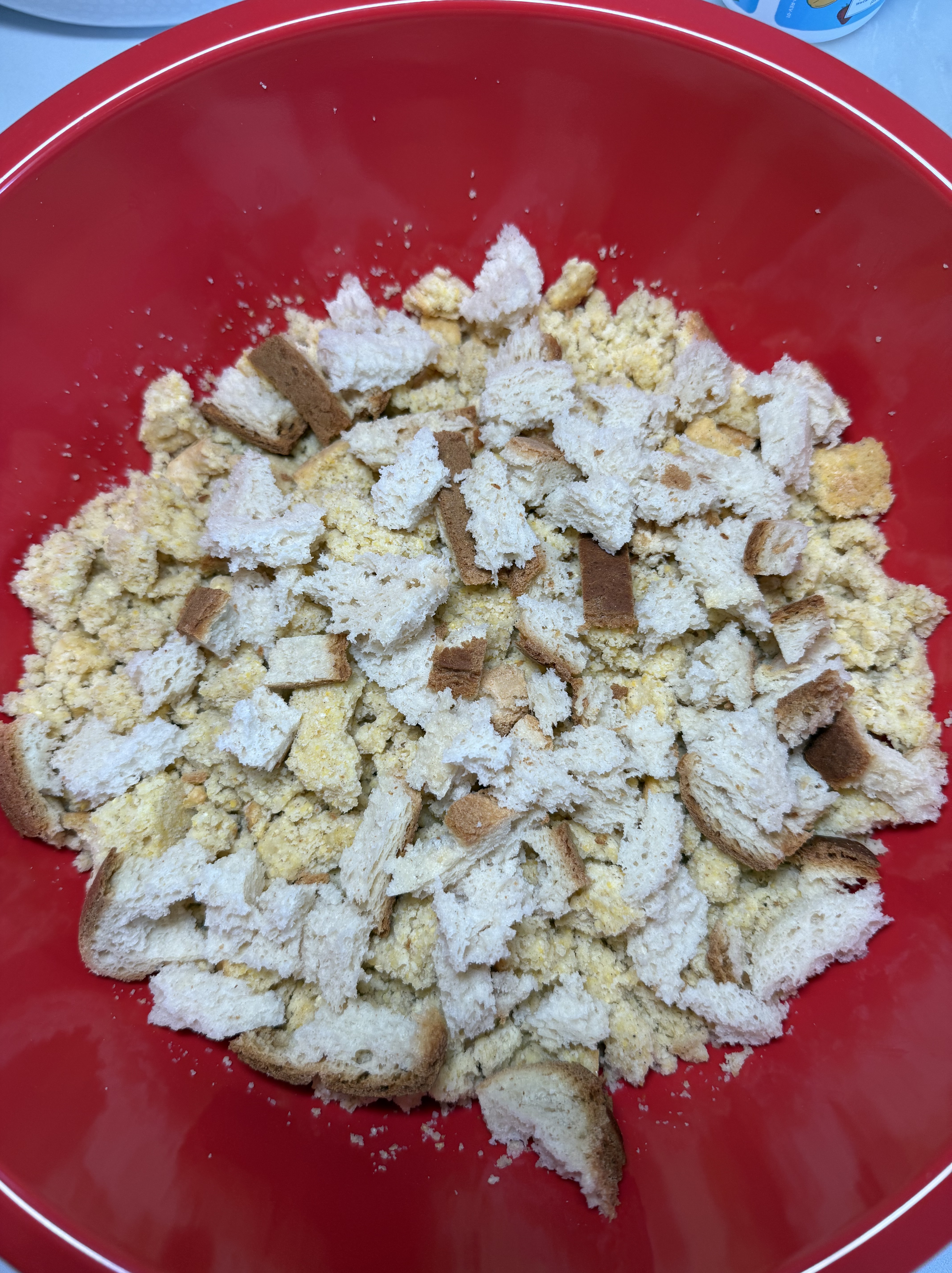 - Tear 2-3 pieces of GF loaf bread into small pieces and add to bowl with cornbread