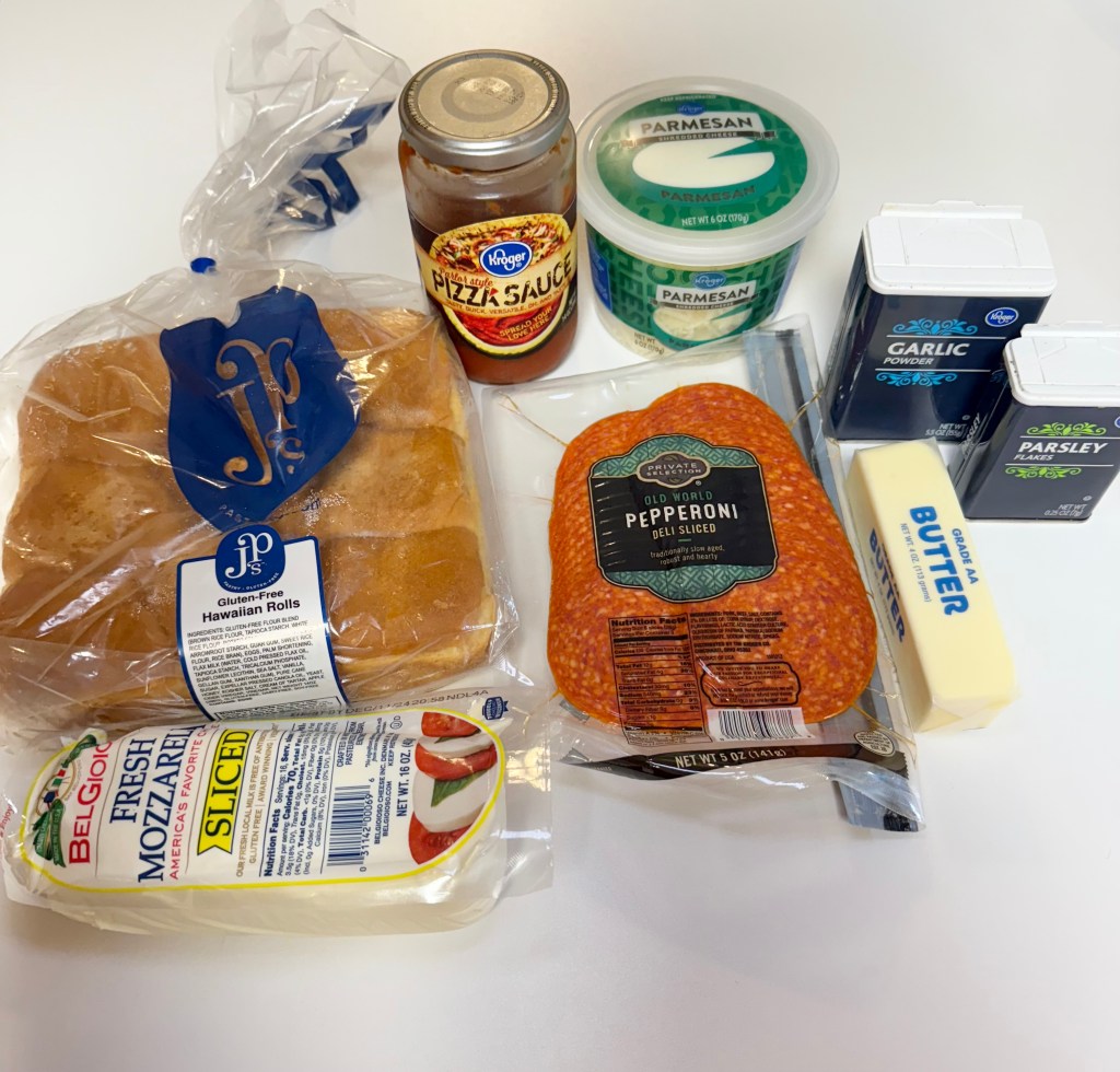 I found some gluten free Hawaiian rolls at Whole Foods the last time I was there, so that is what I used to make these! I have posted a picture of the package below (and the rest of the ingredients needed for this recipe) so you can keep an eye out for them.