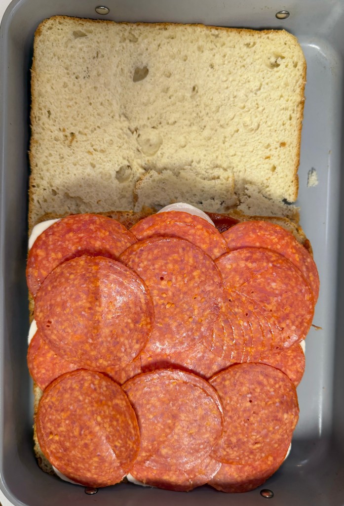 - Put the tops of the rolls on top of the pepperoni layer.