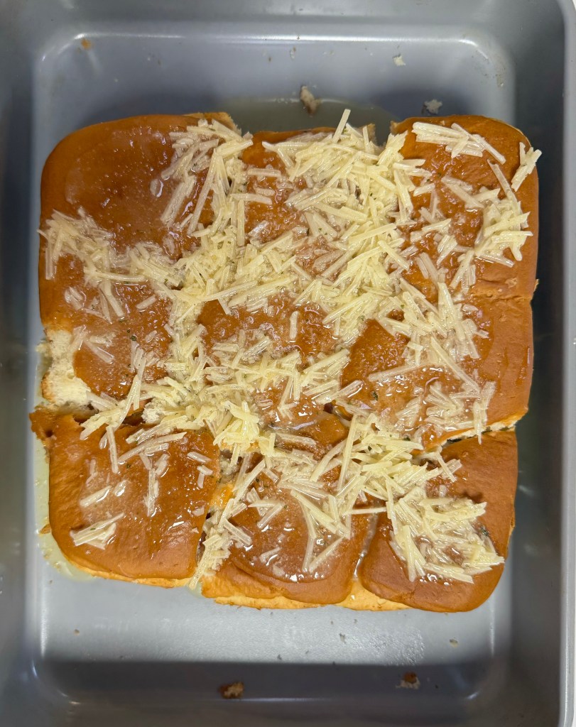 - Slice your package of Hawaiian rolls in half to separate the tops and bottoms.