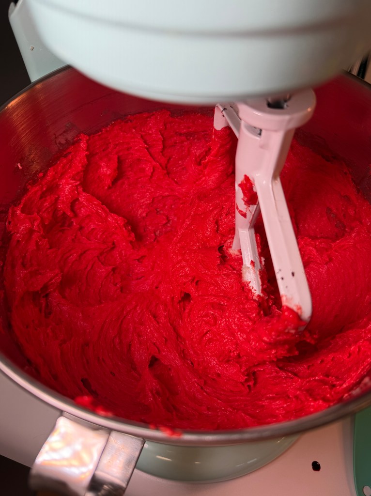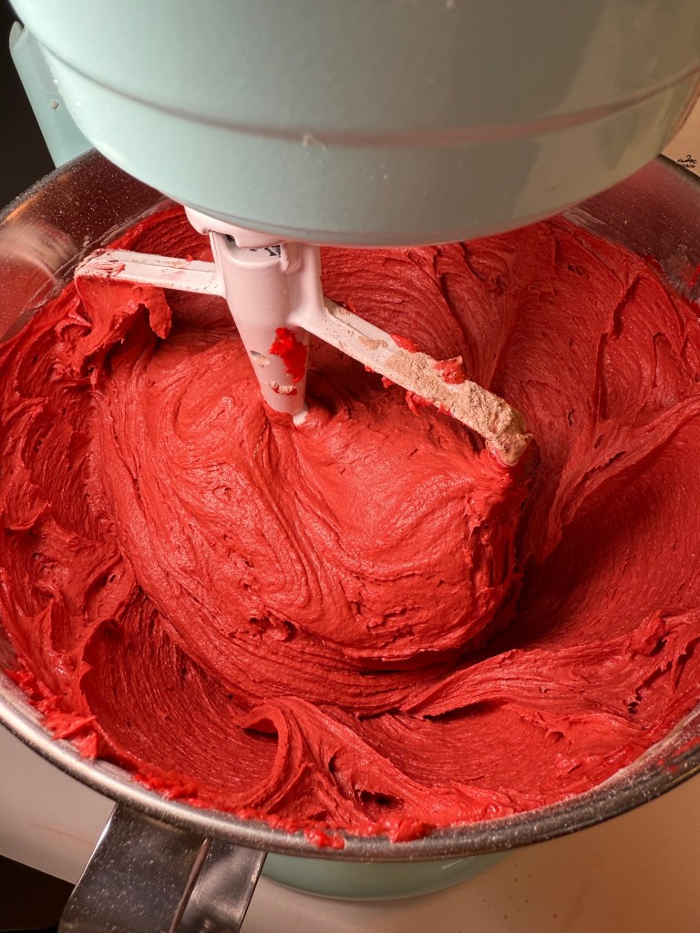 - Add vanilla extract, white vinegar, and red food coloring until combined well. Use a spatula to scrape the sides of your bowl down if necessary.