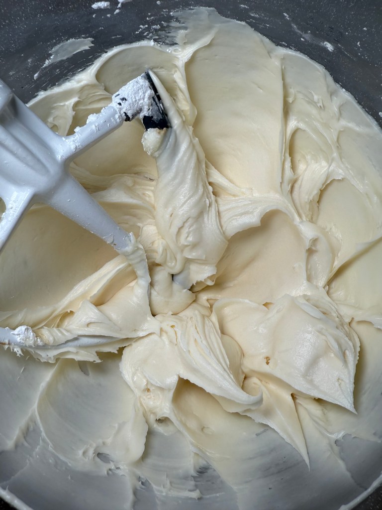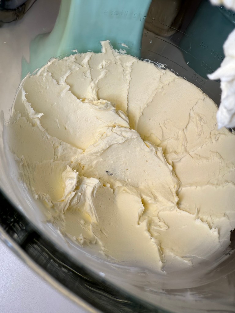 - Add softened cream cheese and butter to the bowl of a stand mixer, fitted with the paddle attachment, and mix until smooth and creamy.