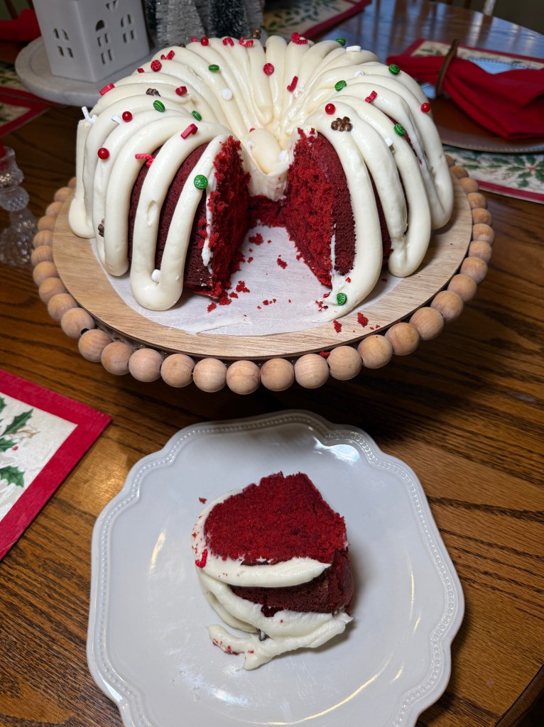 This is one of our favorite holiday recipes, and it never lasts long once I make it! It is a moist and delicious red velvet cake with cream cheese icing.