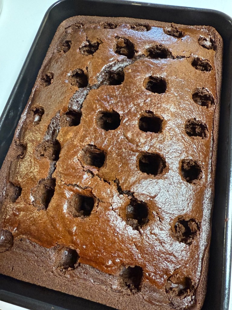 - Once cake is cool, use the end of a wooden spoon to poke holes all throughout your cake about 1 inch apart.