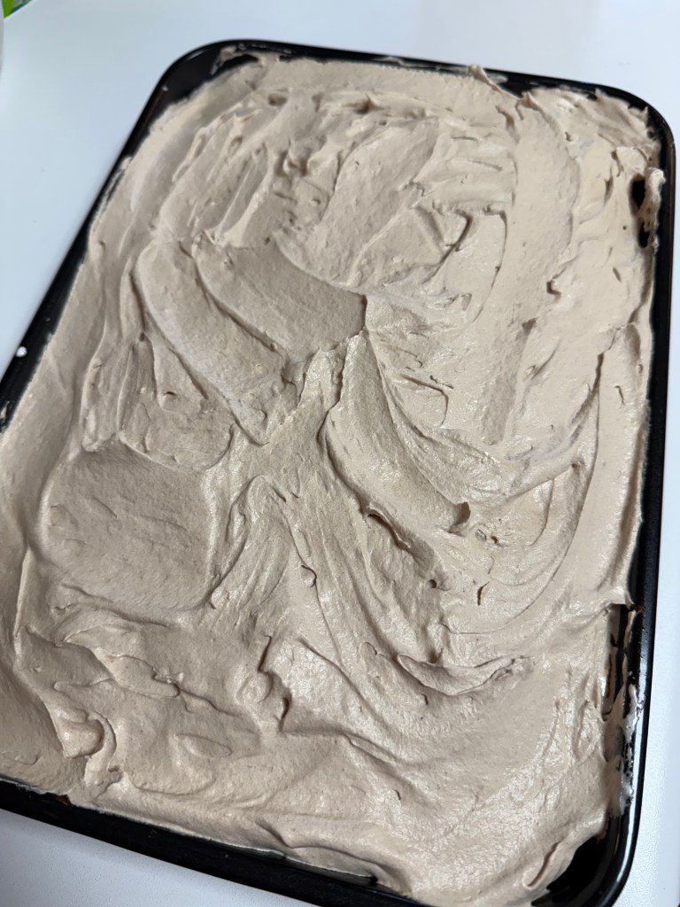 Add your cool whip/hot cocoa mixture and spread evenly to cover the whole cake.
