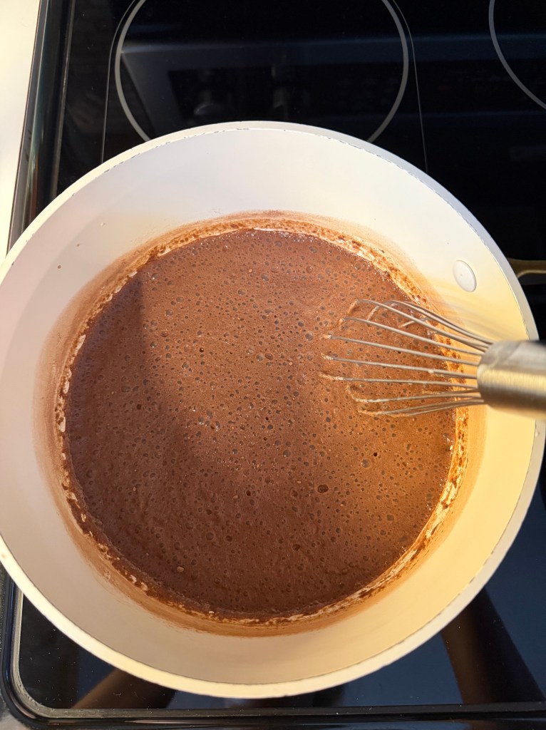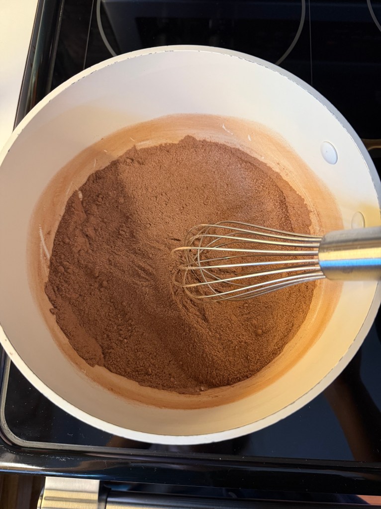 - Whisk together dry ingredients in the saucepan.