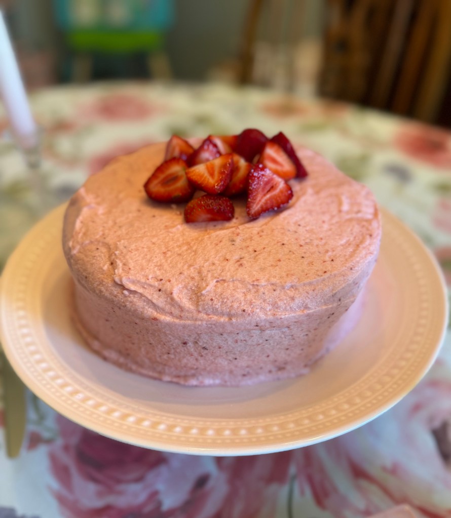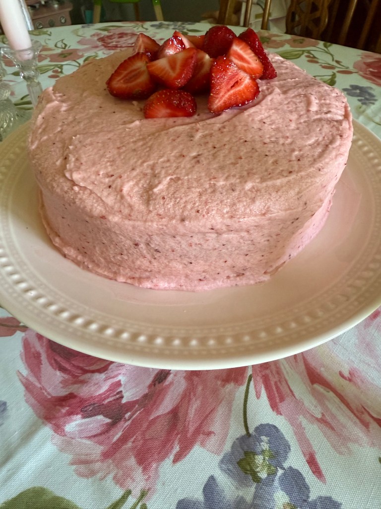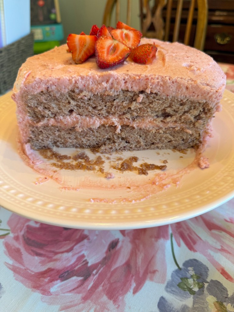This is a homemade strawberry cake with strawberry buttercream icing. It is so delicious!! The best treat for spring and summer!