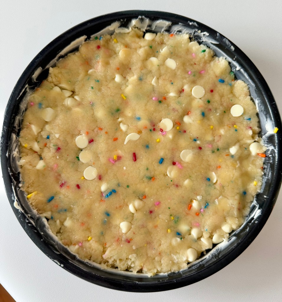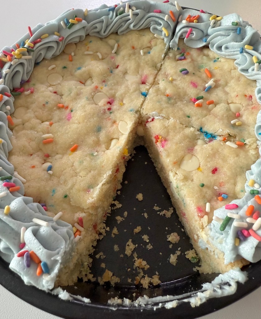- Ice your completely cooled cookie cake as you like. Add extra sprinkles if desired.
