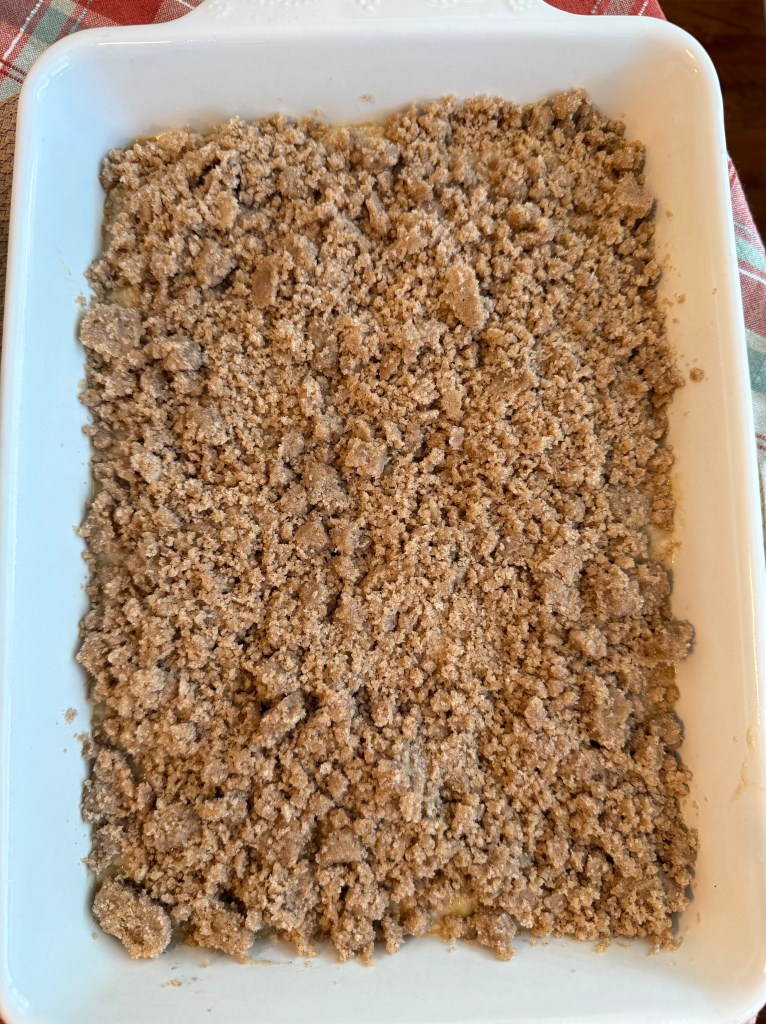 - Sprinkle streusel evenly over cake batter.